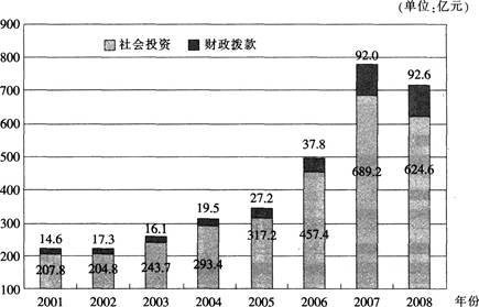 2001~2008年,社会投资用于地质勘查投资的资金平均每年约增加( )亿元。