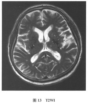 患者男,61岁。因“发作性头晕2年,加重伴记忆力下降、走路不稳3月余”就诊。查体:BP140/70mmHg;意识清楚,构音障碍,近期记忆力及远期记忆力均减退,以远期为主,计算力、理解力、定向力粗测正常。影像学检查见图13~图17。